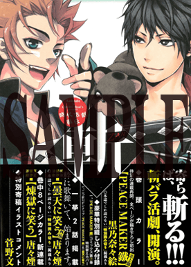 限定版ムック「PEACE MAKER 鐵」油小路編(※現在は発売しておりません)の表紙を飾った人気の高いキャラクター永倉新八&藤堂平助&原田左之助のイラストを使用。