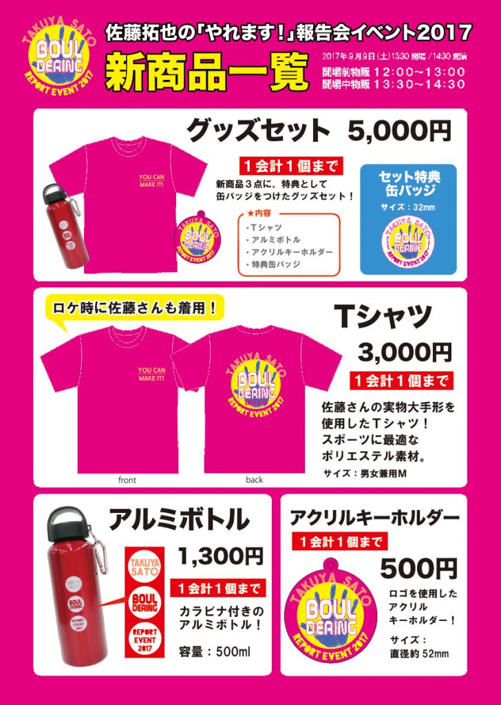佐藤拓也の「やれます!」報告会イベント2017の物販のお知らせです。