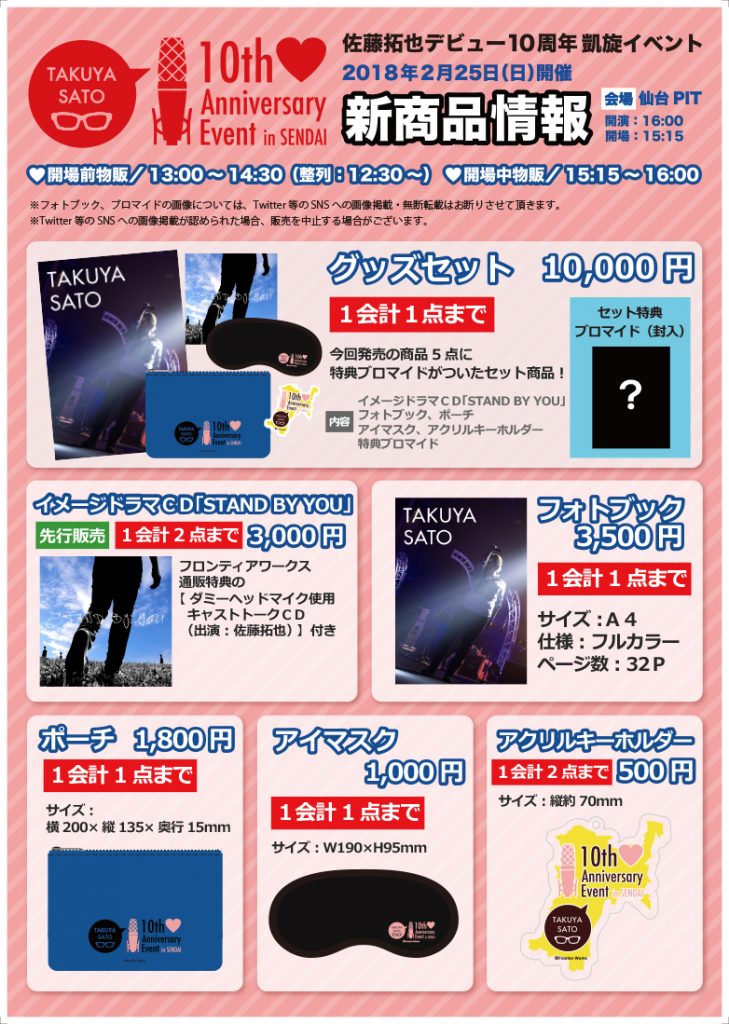 2018年2月25日開催の佐藤拓也の「やれます!」Presents 佐藤拓也デビュー10周年凱旋イベントの物販のお知らせです。