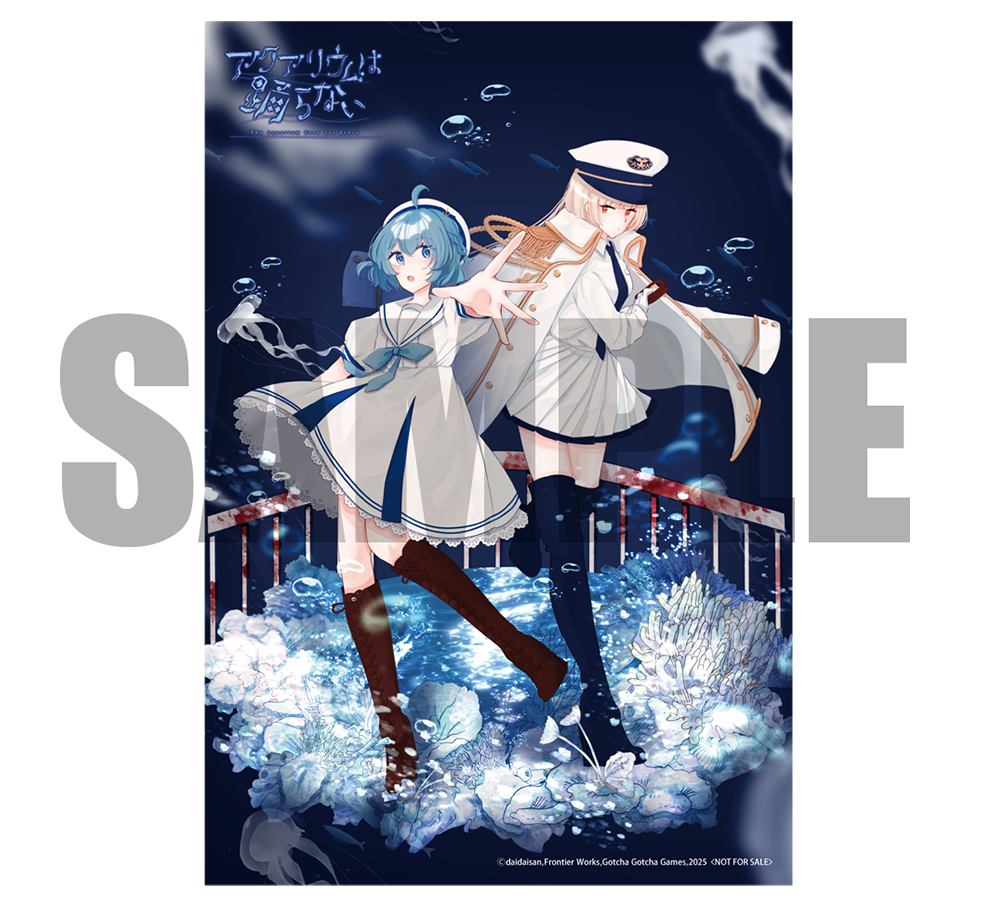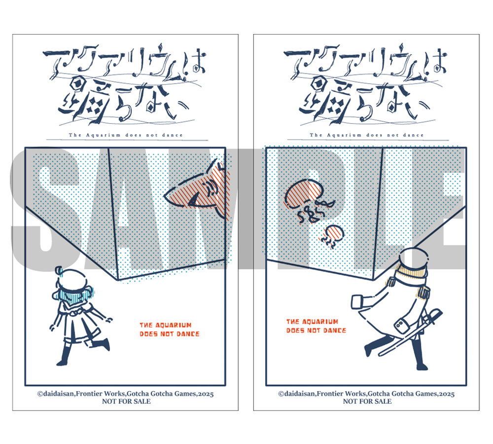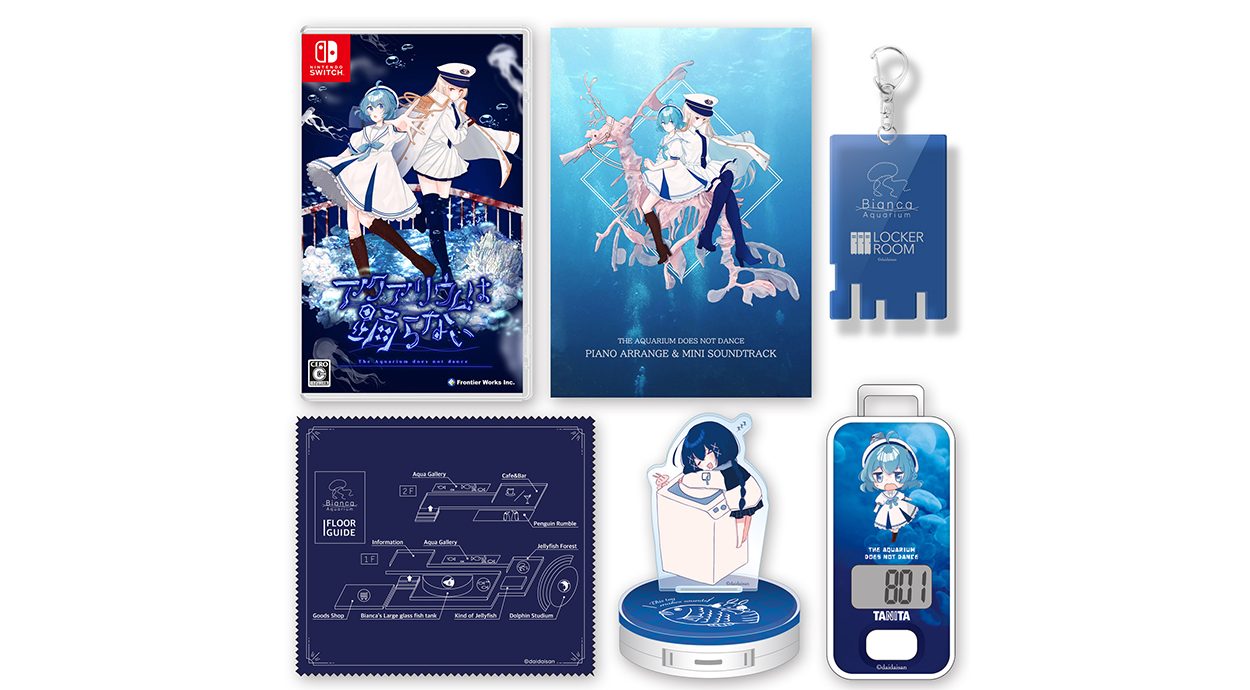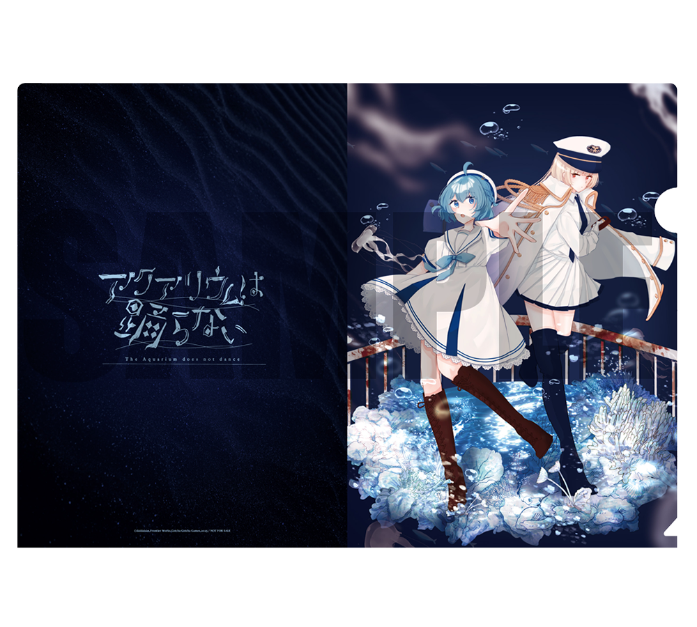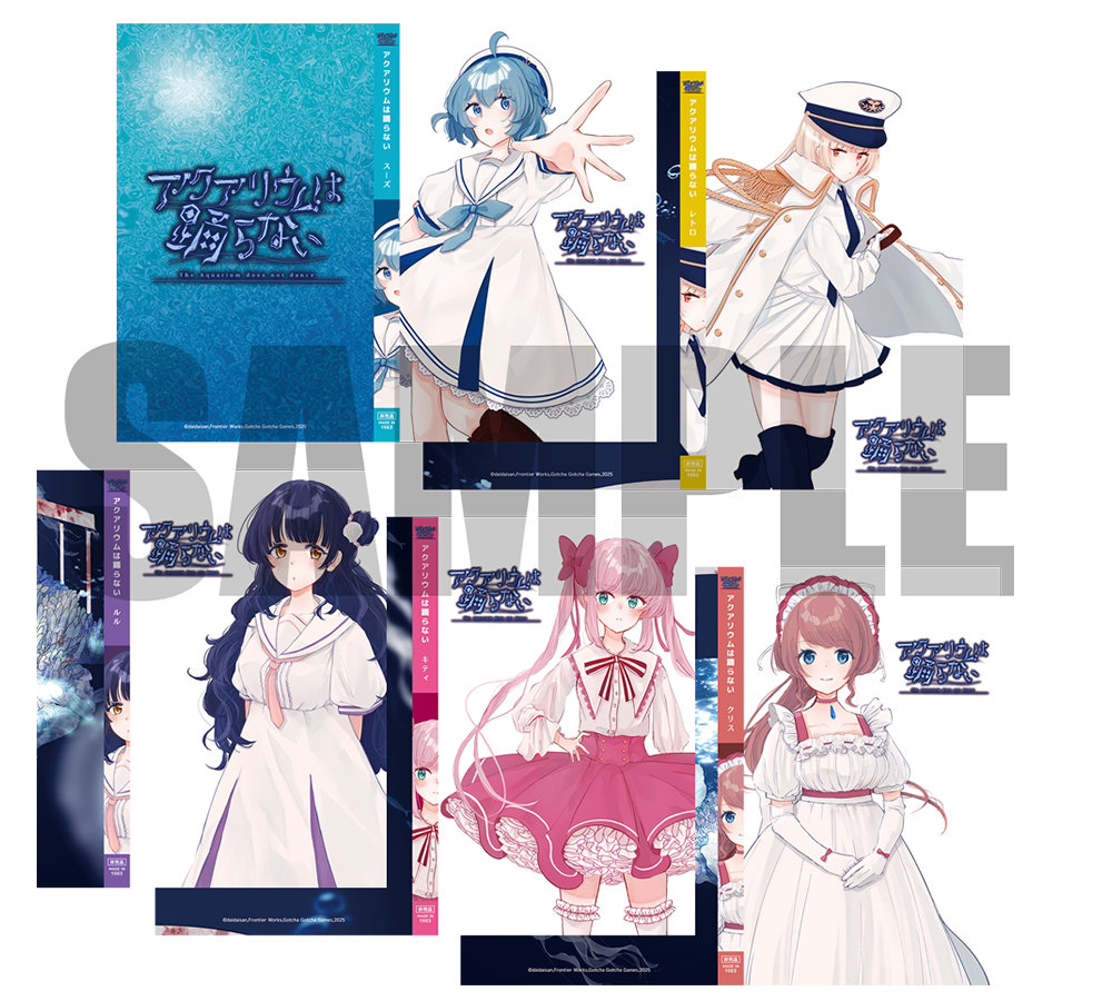 ビアンカ水族館の「プレミアム入場券」「一般入場券」のほか、橙々氏によるキャラクター集合イラスト、ゲーム内ドット絵を使用した透明感ある全4種のクリアしおりセット。