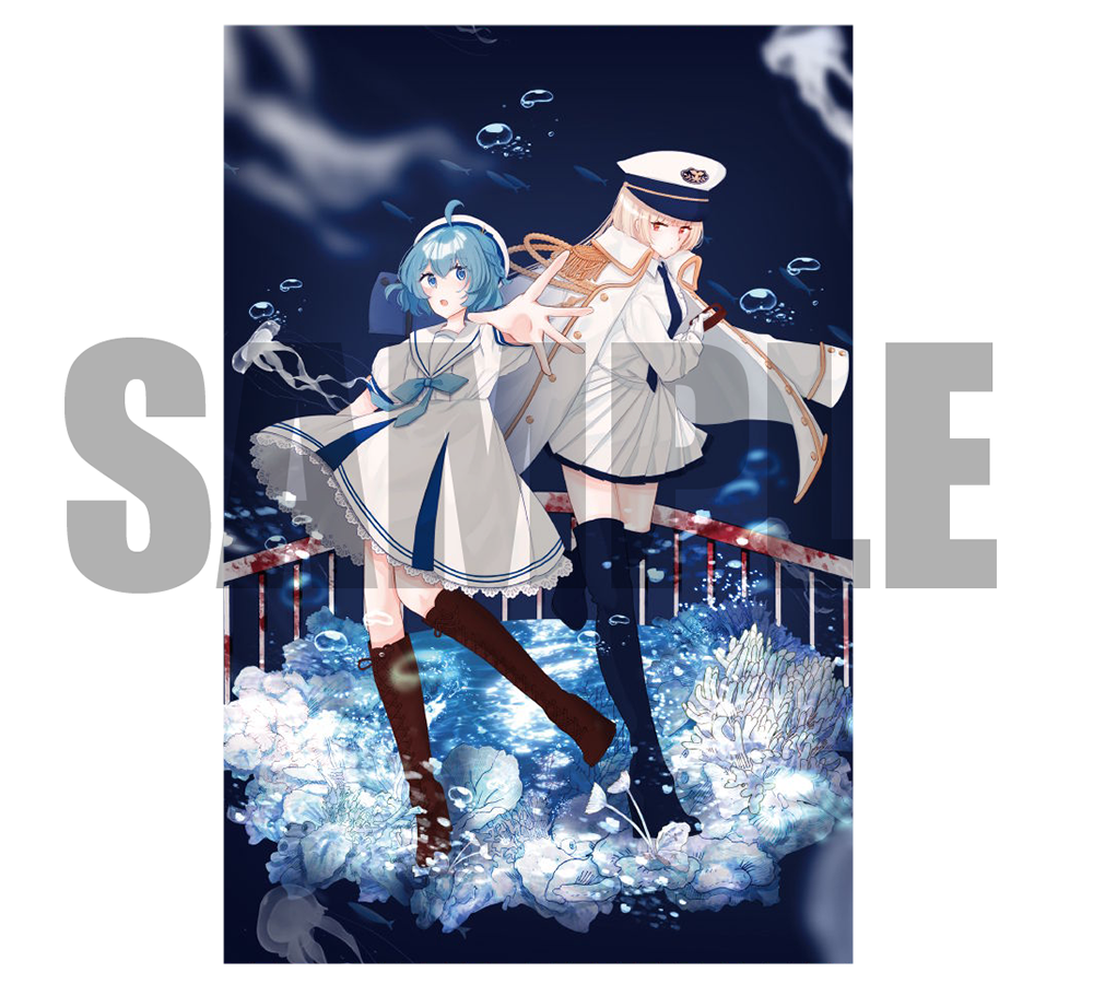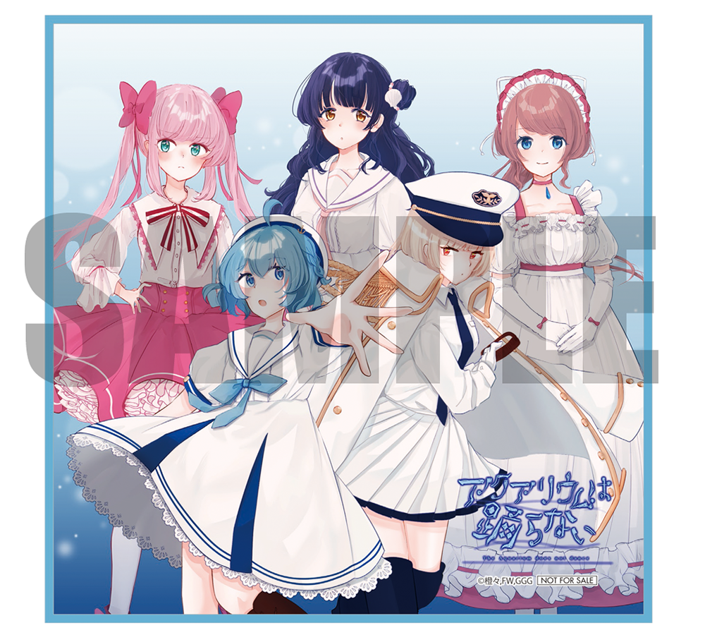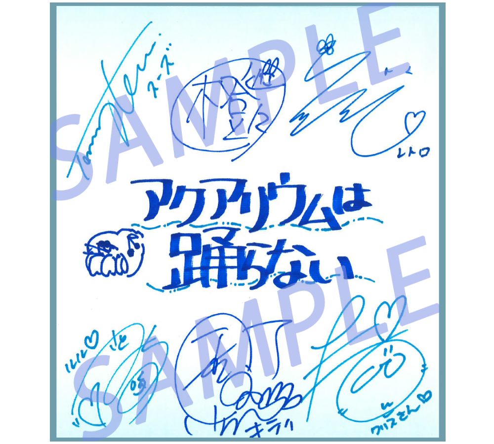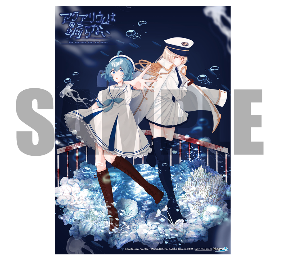ビアンカ水族館の「プレミアム入場券」「一般入場券」のほか、橙々氏によるキャラクター集合イラスト、ゲーム内ドット絵を使用した透明感ある全4種のクリアしおりセット。