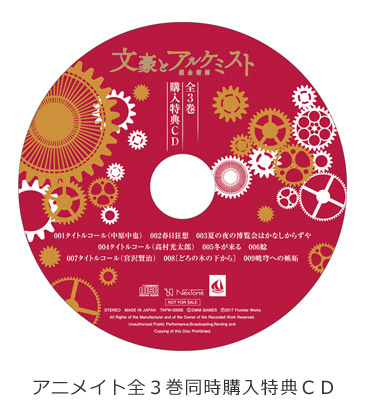 ・全3巻同時購入特典「特典CD」(本編CDに未収録の3名の詩の朗読を収録。通常盤全3巻同時購入でも同じものが付きます。AGF2017会場でのアニメイト限定盤全3巻同時購入でも同じものが付きます)