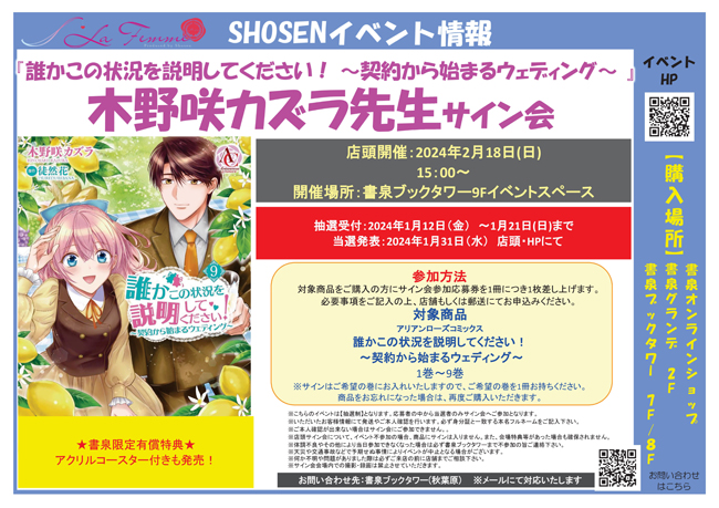 ※サインを入れていただく巻は、アリアンローズコミックス『誰かこの状況を説明してください! ~契約から始まるウェディング~ 』1巻~9巻の中から1冊お持ちください。複数冊をお持ちいただいてもサインをお入れするのは1冊となります。