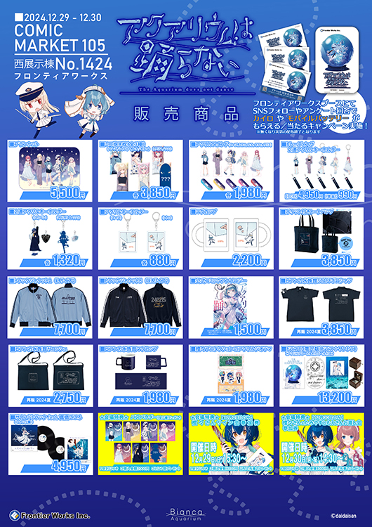12/30のコミックマーケット105会期中、フロンティアワークスブースにて「アクアリウムは踊らない」商品を1会計につき8000円以上をお買い上げの方に、