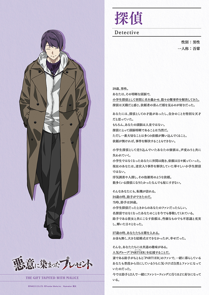 マーダーミステリー「悪意に染まったプレゼント」プレーヤーキャラクター「探偵」のクリアファイル。 プロフィールやバックボーンが記載されたキャラクターシートを封入。 素材:PET 紙 サイズ:A4(横210mm縦297mm) 原産国:中国