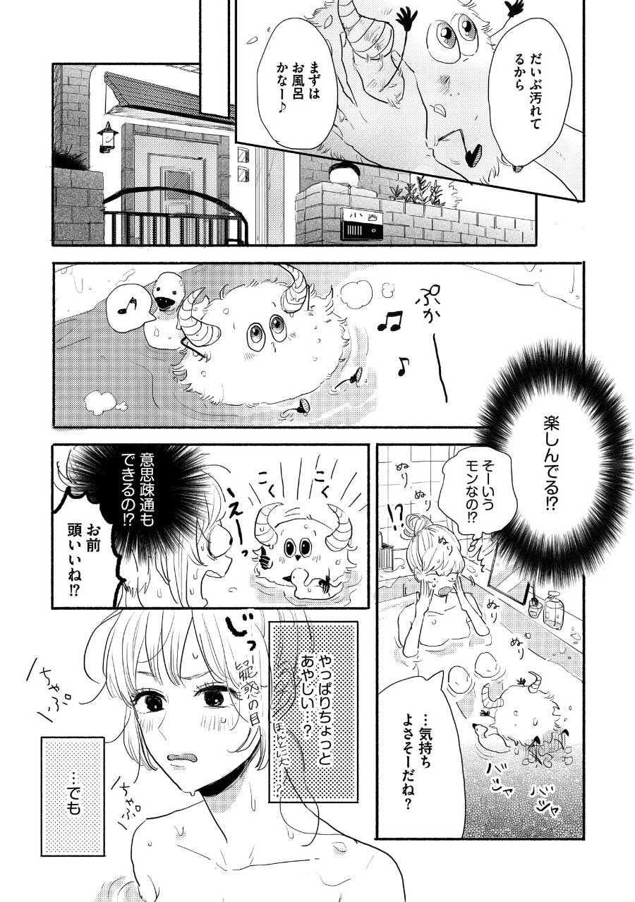ある時、ふわふわの丸い姿にツノが生えた変な生き物(ふわモン)を拾う。