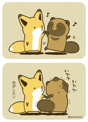 とっても仲良しなのんびりタヌキといたずらキツネ。