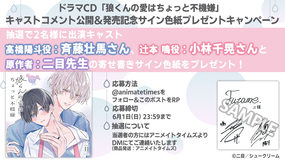 二目先生原作の超話題作、ドラマCD「狼くんの愛はちょっと不機嫌」より高橋陽斗役:斉藤壮馬さん、辻本 鳴役:小林千晃さんのキャストコメントが到着!