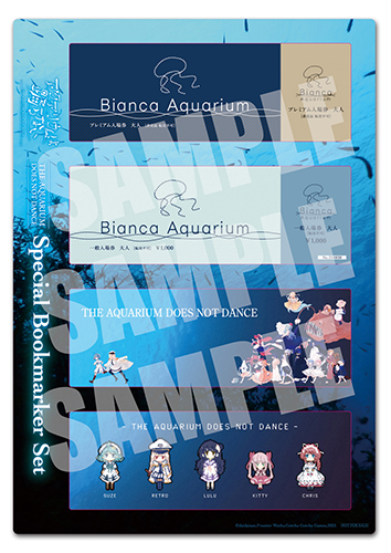 ビアンカ水族館の「プレミアム入場券」「一般入場券」のほか、橙々氏によるキャラクター集合イラスト、ゲーム内ドット絵を使用した透明感ある全4種のクリアしおりセット。(しおり本体115×40mm、台紙210×148mm)