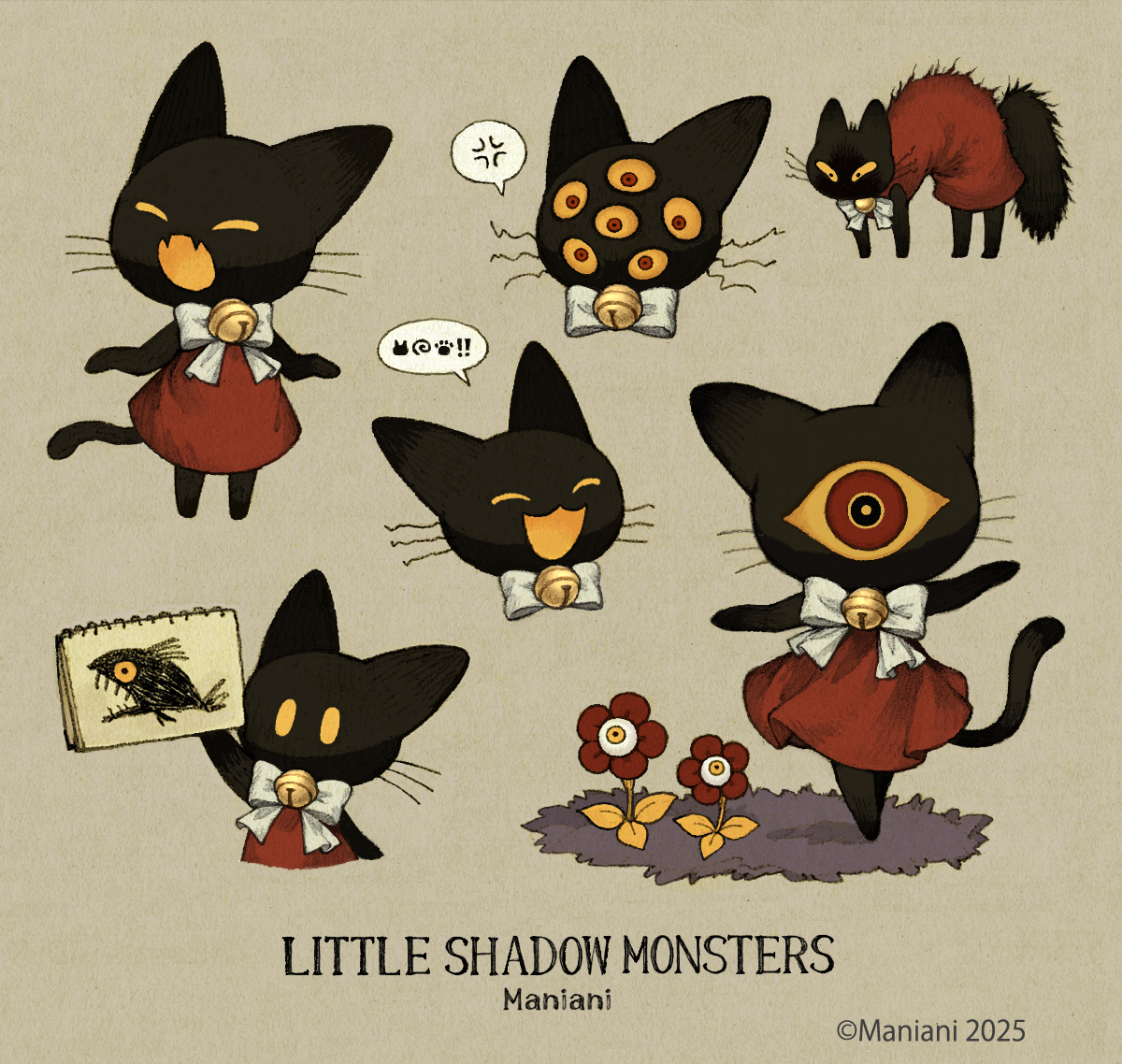 「Maniani作品の代表的なシリーズのひとつ、『SHADOW MONSTER』は、一見するととても愛らしいキャラクターですが、ふと目を離した次の瞬間、異形の姿へと変貌してしまう、危うい闇の魅力を内包しています。その多彩なキャラクターはユーモアと毒気、愛らしさのバランスが絶妙で、その独自の世界『Maniani World』の世界観に観る人は惹きこまれるはずです」