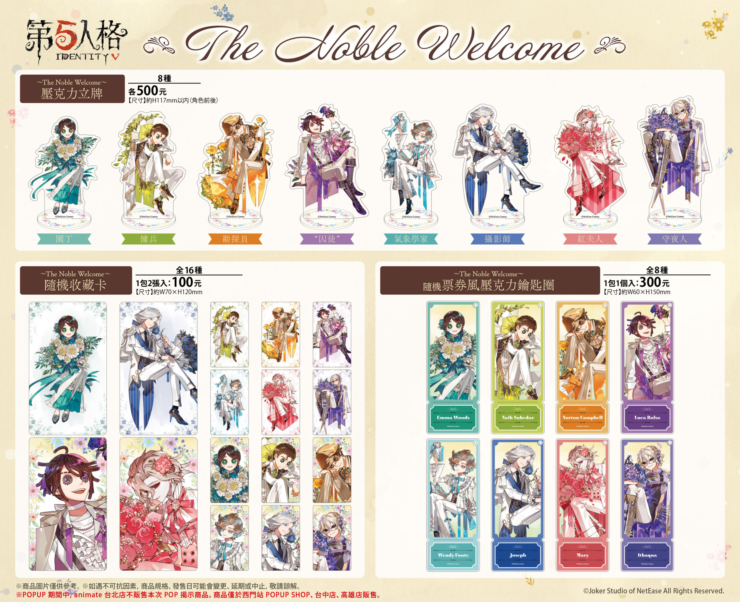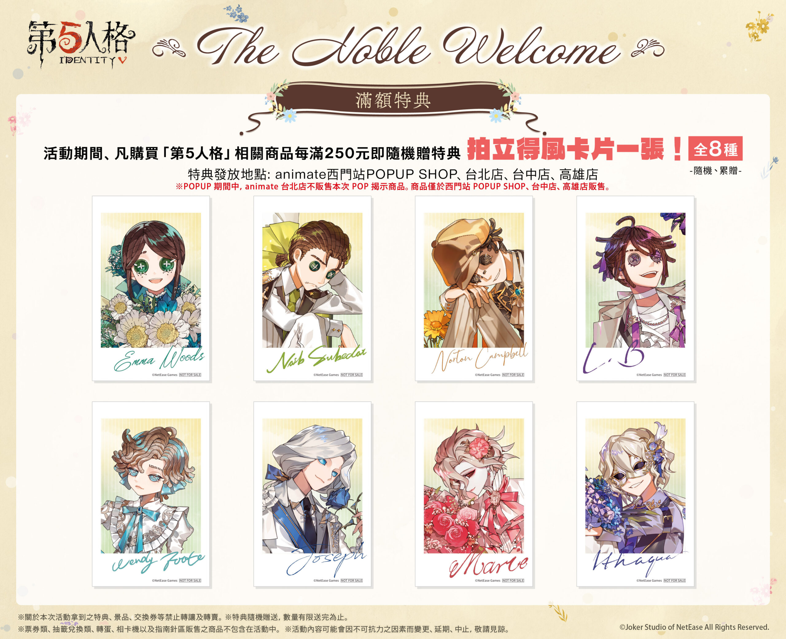 ポップアップショップでは2025年11月に初めて販売した「~The Noble Welcome~」シリーズのグッズを販売する予定です。また、イベント期間中、『Identity V 第五人格』関連商品をNT$250ご購入ごとに購入特典として「チェキ風カード(全8種)」をランダムで1枚配布します!