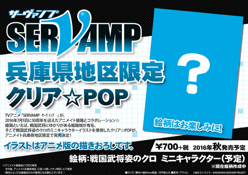 そこでアニメ描き下ろし! 戦国武将姿のクロのミニキャラクターイラストを使用した【TVアニメ「SERVAMP-サーヴァンプ-」アニメイト兵庫県地区限定クリア☆POP】が登場です☆