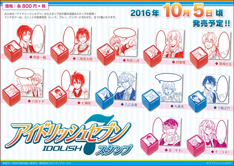 2016年7月26日、TOSYO株式会社(代表取締役社長 中川貴文)と、株式会社フロンティアワークスは、共同で手掛ける「アイドリッシュセブン」のキャラ印(スタンプ)を全国アニメイト及びアニメイトオンラインショップで予約受付け開始しました。2016年10月5日の発売に先立ち、2016年7月26日~全国アニメイト店頭及びアニメイトオンラインショップにて絶賛予約受付中です。