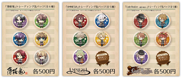 販売商品:グッズセット、「薄桜鬼」缶バッジ、「AMNESIA」缶バッジ、「Code:Realize ~創世の姫君~」缶バッジ