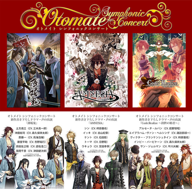 2016年9月19日(月・祝)開催、オトメイトが誇る大人気ゲーム『薄桜鬼』『AMNESIA』『Code:Realize ~創世の姫君~』を題材に、名曲の数々を完全生のフルオーケストラでお届けする「オトメイト シンフォニックコンサート」。