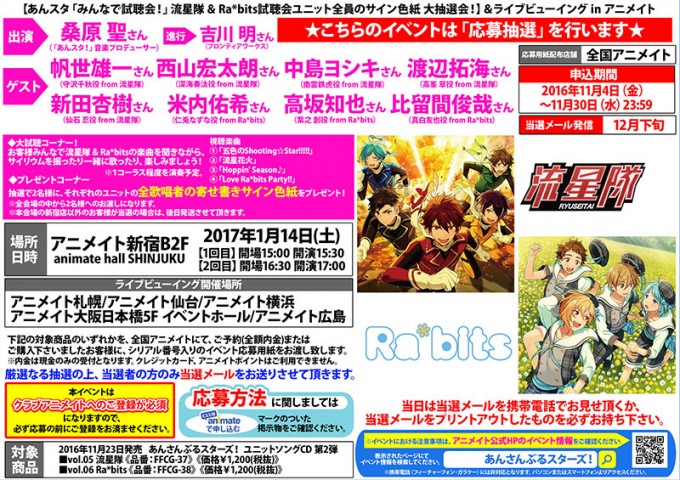 2016年11月23日(水)発売予定の「あんさんぶるスターズ!」ユニットソングCD第2弾 vol.05 流星隊、vol.06 Ra*bitsの発売記念リリースイベントの開催が決定!!