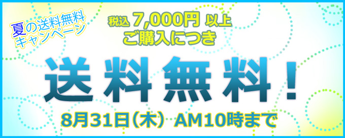期間中1回のご注文につき、商品代金の合計が税込7,000円以上お買い上げで配送料が無料となります。