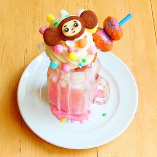 ゲーナカラーのメロンソーダにバニラアイスと生クリームを添えた贅沢なドリンク。限定缶バッジ付です。