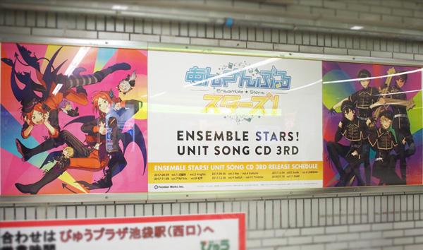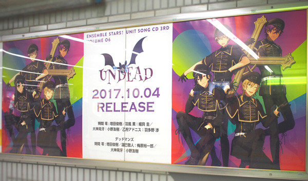 スマートフォン向けアイドルプロデュースゲームアプリ『あんさんぶるスターズ!』より、ユニットソングCD第3弾シリーズの発売を記念して、JR池袋駅の北口改札外通路に、10月8日(月)~10月14日(日)の期間限定でvol.5「2wink 」& vol.6「UNDEAD」のジャケットビジュアルのビッグサイズポスターが掲載中!!