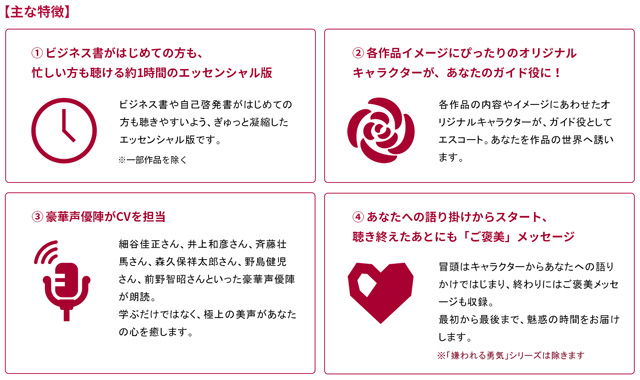 ①豪華声優陣をガイド役に、ビジネス書や自己啓発書を要約・再構成したオーディオブックの新レーベルです。