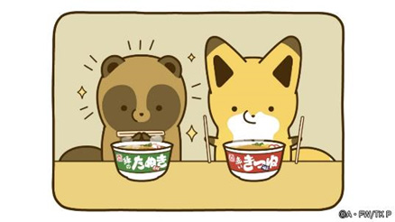 ▲「赤いきつねと緑のたぬき」をタヌキとキツネは上手に食べられるかな…?
