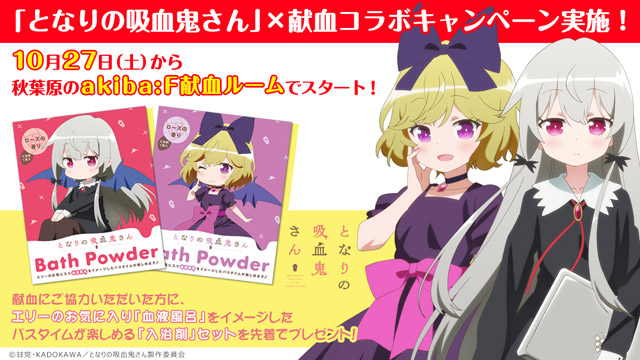 2018年10月からTVアニメ放送開始の「となりの吸血鬼さん」とのコラボ企画を秋葉原のakiba:F献血ルームで行います。