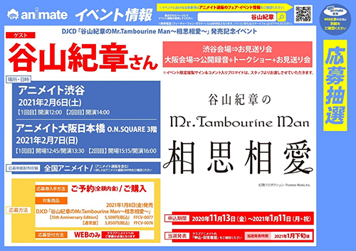 DJCD「谷山紀章のMr.Tambourine Man~相思相愛~」通常盤及び豪華盤の商品をお渡し時に配布いたします。