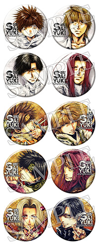 ★全10種の缶バッジ。峰倉かずや先生によるデザイン。三蔵一行は通常衣装に加えてシックな装いも。