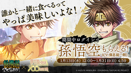 期間中、 アプリにログインすると1日目と10日目に「孫悟空(CV:保志総一朗)」に出会えます。 その他にも、 妖精石や教育係などの豪華アプリ内アイテムをプレゼントいたします。