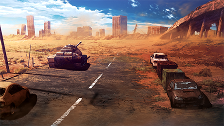 今回解禁されたティザービジュアルはすべてを突き破る作品の勢いそのままに主人公・ビスコとミロが眼光を覗かせる。あわせて解禁となったティザーPV(https://youtu.be/HF-ZL91ZkTQ)では、来るものを寄せ付けない砂漠、巨大生物、巨大兵器が主人公たちの行く手に襲い掛かる!