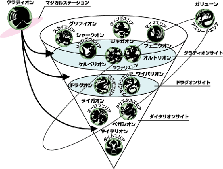 ネギシ そこはシリーズの構成にも絡んでいて。まず商品企画として、年間にどれだけロボットを出したいかの計画が、タカラさんから来るんです。そのうちの3体くらいが主力となるデラックス仕様で、グラディオンは当然それで。さらにドラグオンやダイタリオンもその仕様の商品なんですが、玩具には春、夏、冬で大きな商戦時期があるので、春は主役ロボのグラディオン、夏場がドラグオン、そして冬のクリスマスに向けにダイタリオンという発売スケジュールが事前に決まってました。それに合わせて物語の山場を作るわけです。やっぱり一番最後に来るのは最強の敵……つまりダイタリオン。そこに至る前には、ライバルとなる強敵・ドラグオンが出てくる。だからマジカルゲートは3層に分かれてる世界観で、一番奥にダイタリオンがいて、その手前にドラグオンがいる構造になってるんです。一層ずつクリアしていく度に本来は仲間である敵が出て来て、そこでグラディオンが「眼を覚ますんだ!」となる展開なんですね。その構成に合わせる形で世界観を考えたわけです。