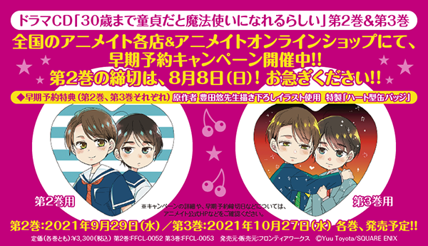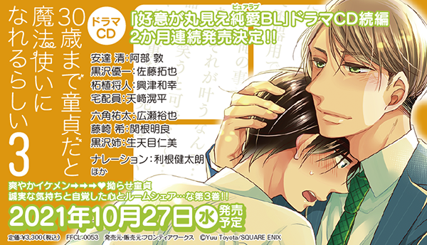 「ガンガンpixiv」(スクウェア・エニックス)で大人気連載中の純愛BLマンガ『30歳まで童貞だと魔法使いになれるらしい』(原作:豊田悠先生)より、2021年9月29日(水)発売予定のドラマCD第2巻、そして2021年10月27日(水)発売予定の第3巻の新情報をお届けします♪