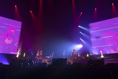 後半の『Valkyrie』は「Eternal Weaving」と「今宵月の館にて」を続けて披露。ハロウィン楽曲の「今宵月の館にて」では、高橋さんと大須賀さんの歌声もファンを誘い込むようなねっとりさが増し、仮面を被ったダンサーとダークな世界観を届けます。なかでも短い単語をお互いに被せるようにして歌うパートは、鬼気迫った『Valkyrie』の凄みが強く伝わってくる部分でした。
