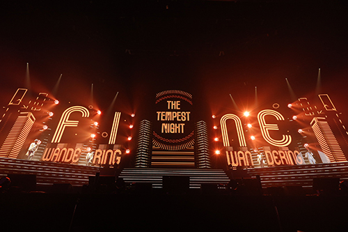 サプライズだったシャッフルユニットの登場で興奮した会場をさらに盛り上げたのは、今回ゲスト出演の『fine』。緑川さんの「お待たせ」という言葉から始まった「The Tempest Night」は大人っぽいダンスミュージックです。間奏では中央階段上にいた緑川さんと村瀬さんが降りてくるのですが、緑川さんは後ろにダンサーを従えて、村瀬さんは両手をエスコートしてもらって、という対称的な降りかた。その光景は皇帝と姫のようでした! またラスサビ前ではしっとりした声で歌う橋本さんたちに続き、江口さんによるファンも待ち望んでいただろう「愛!」がバッチリ響き渡りました。