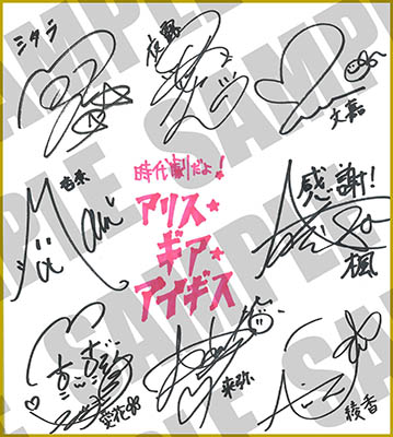 対象のショップにてドラマレコード「時代劇だよ!アリス・ギア・アイギス」をご購入いただいた方の中から抽選で、出演キャスト寄せ書きサイン色紙をプレゼント!