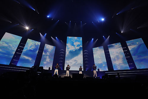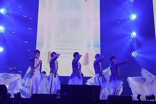 続いて登場したのは、『Knights』で「Promise Swords」からスタート。ここではシフォン生地のような透明感のある布を持ったダンサーが登場し、フリルが入った『Knights』の衣装も相まって、全体的にふわっとした柔らかいステージに。しかし、サビで浅沼さんや土田さんが歌う「大丈夫」の歌詞や、5人が剣を捧げる仕草などはとても力強く、美しさと気高さの両方を感じました。