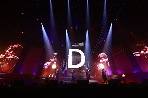 切ない余韻が残ったステージの雰囲気を変えたのは、『ALKALOID』の「Distorted Heart」。勢いよく噴射されたスモークに押されるように、スピーディーな歌声とダンスで会場を魅了します。ここで前日に引き続き、サプライズゲストの『Valkyrie』が登場し、フュージョン曲「Artistic Partisan」を熱唱! 真っ赤に煌くミュージアムをイメージしたステージで、一列に並んで歌う『ALKALOID』と『Valkyrie』からは鬼気迫るような迫力を感じます。劣等生のレッテルから地道に一歩ずつ這い上がってきた『ALKALOID』と、どん底に突き落とされ、そこから復活を遂げた『Valkyrie』は、似たような反骨精神を持ったユニットなのかもしれません。