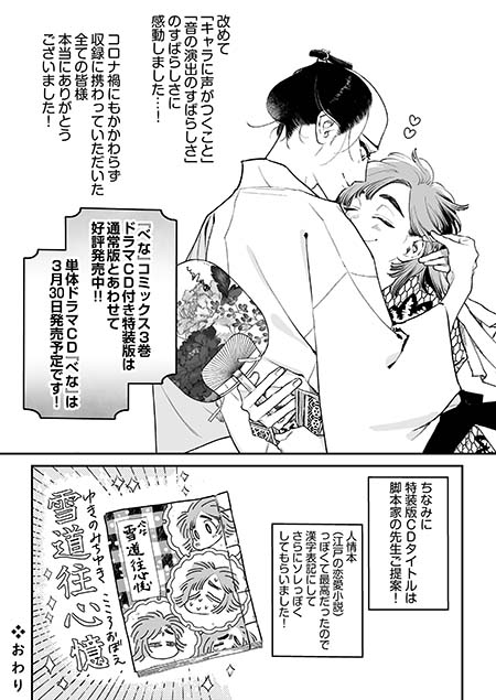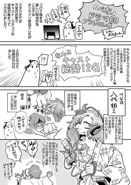 今回のドラマCDと、コミックス特装版用ドラマCDの収録の模様を、「べな」原作者のこふで先生がアフレコレポートマンガとして描き下ろし!