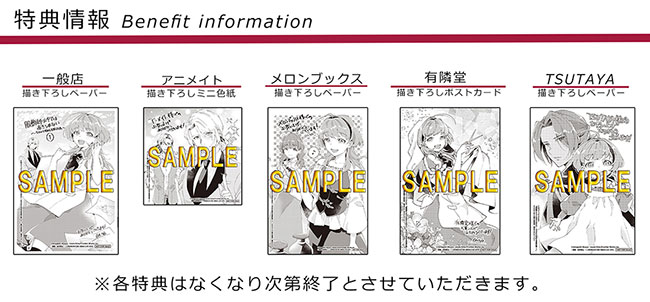 書店:アニメイト(描き下ろしミニ色紙)、メロンブックス(描き下ろしペーパー)、TSUTAYA (一部書店・描き下ろしペーパー)、有隣堂(描き下ろしポストカード)、その他書店(描き下ろしペーパー)にて実施