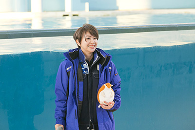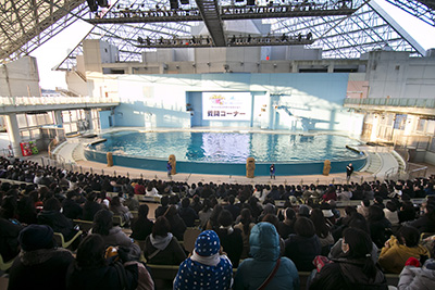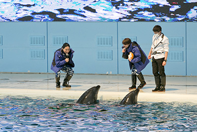 福山さん、田村さんがそれぞれステージの左右に分かれ、間近でイルカたちを見られる特等席に移動し、「イッツ“ヌー”タイム!」の掛け声でショーが開演!