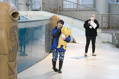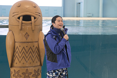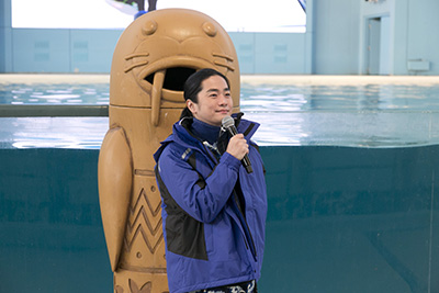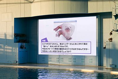 続いては、海の生き物や、シーパラダイスにまつわるクイズにお二人が挑戦するクイズ対決のコーナー。正解かどうかは、シーパラダイスで飼育されているセイウチの「アコちゃん」がポーズで判定してくれます。