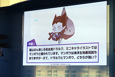 第1問は「海洋生物最弱と噂されるマンボウと、ドラルクはどちらが強い?」。水中戦の想定と聞き、田村さんは「さすがに水中戦ならマンボウじゃないですか?」と回答。判定は……見事正解! 正解のポーズ(寝そべりながら拍手)をするアコちゃんにお二人も、お客さんも癒されている様子でした。