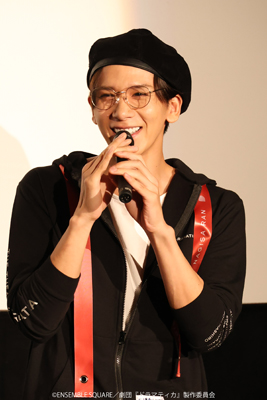 「ACT2/Phantom and Invisible Resonance」の上映前、この日2回目の舞台挨拶があった。ここでは松田さんが帽子と丸メガネ姿で登場、自身が演じたギィ・フェルディナンド風の話し方でファンを喜ばせる。二人は登場するやいなや「ACT2」で話題となった日替わりネタの「ta-taチャレンジ」について大いに盛り上がり、笠舞 歩を演じた山本さんが「まだ役として演技もしていないのに、舞台に出てきて日替わりネタをする舞台なんてほかにはない!」と言い、客席に笑いが起こった。