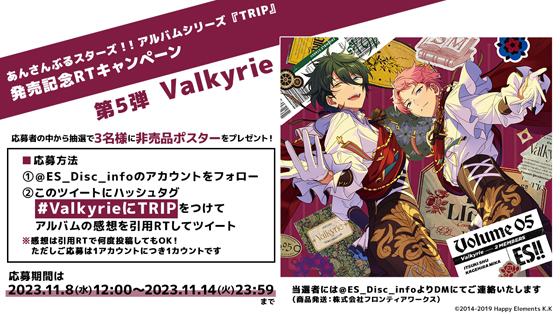 また「あんさんぶるスターズ!!アルバムシリーズ 『TRIP』 Valkyrie」の発売を記念してRTキャンペーンを開催。