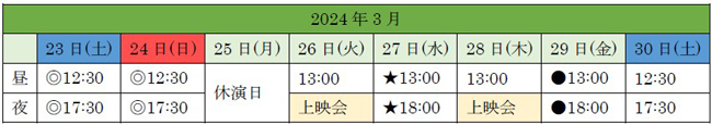 ◎3月23日&24日公演:お見送り会/★3月27日:撮影会/●3月29日:プレゼント抽選会