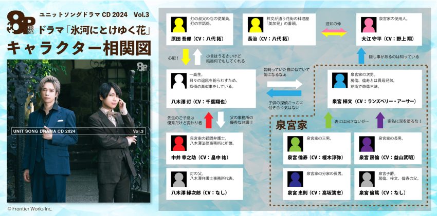 ランズベリー・アーサーさん×千葉翔也さんが主演となるVol.3は、2024年7月24日に発売予定。Vol.3は大正時代のとあるお屋敷で起こる事件を描いたオリジナルドラマ「氷河にとけゆく花」。