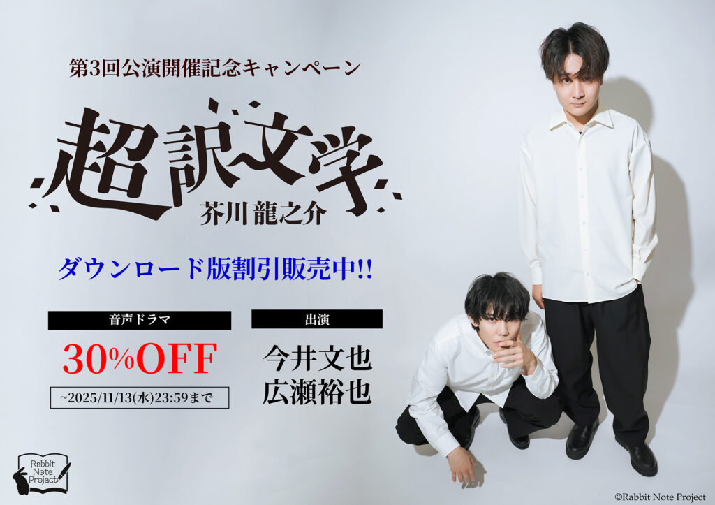 Rabbit Note Project第3回公演の開催を記念して、2024年2月に開催した朗読劇「超訳文学 芥川龍之介」のダウンロード版を割引販売するキャンペーンを実施中です!