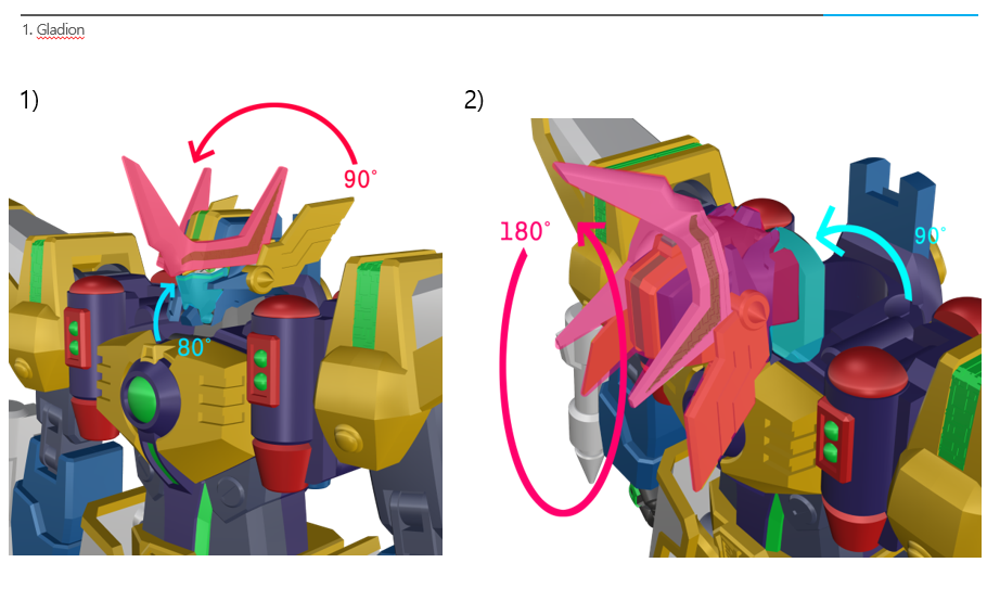 OPに登場するプロポーションのグラディオンをどうすれば完全変形で実現できるか、悩みながらできるだけ劇中・DXのおもちゃと同じ変形シークエンスを再現できるように細かく調整しました。